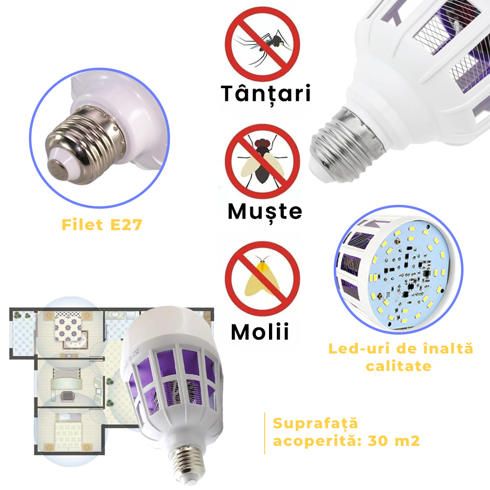 Cu o putere de 20W, acesta lampa UV poate acoperi o suprafata destul de mare, pana la 30 metri patrati, asigurand o protectie eficienta impotriva insectelor in interiorul locuintei tale. Acest aparat anti-insecte este usor de instalat si poate fi utilizat in orice soclu standard E27.