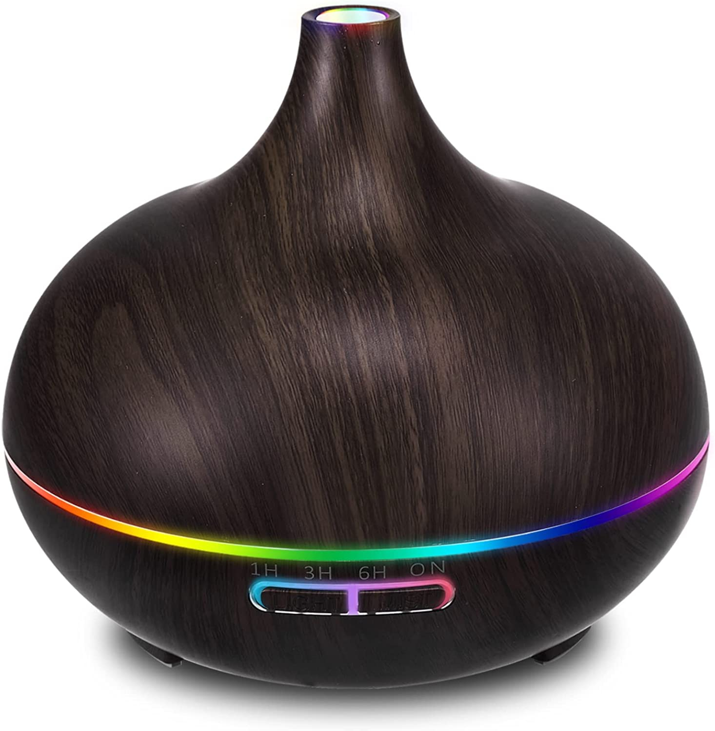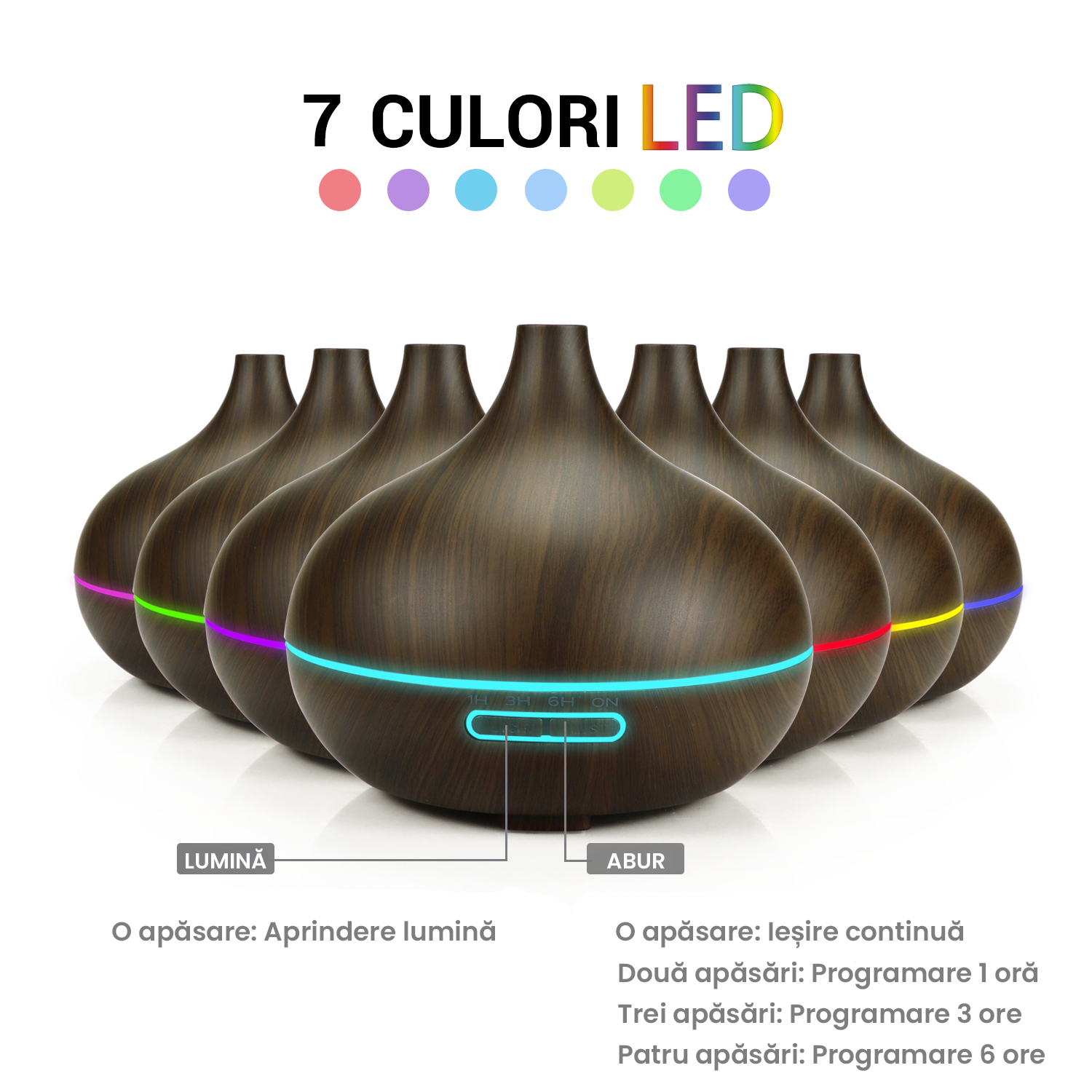 Umidificatorul are un design modern, cu aspect de lemn, culori diferite de lumina LED, este foarte silentios