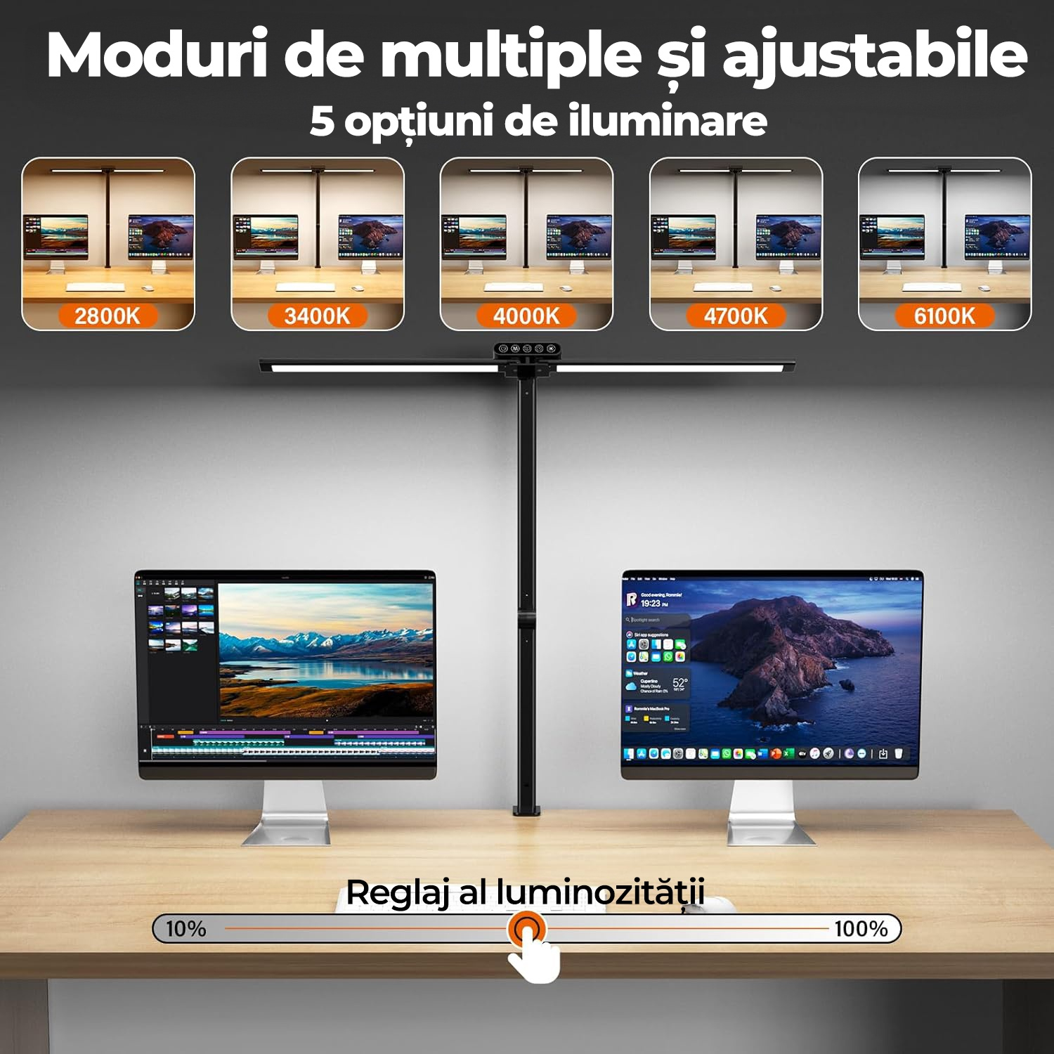 Lumina puternica si uniforma: Capetele duble ajustabile ale lampii ofera o iluminare extinsa si uniforma, cu o intensitate de 1200 lux la centru. Perfecta pentru birouri mari sau pentru activitati care necesita un iluminat constant si clar.