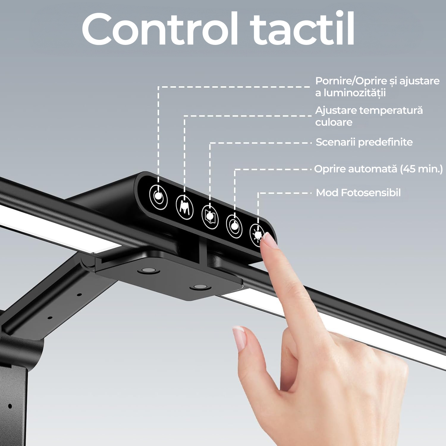 Reglare continua a luminozitatii: Cu un control tactil simplu, poti ajusta luminozitatea de la 0% la 100%, creand atmosfera ideala pentru orice activitate.