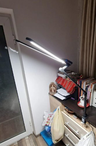 Aceasta lampa de birou cu capete duble, extensibile, ofera o iluminare excelenta pentru birouri mari, mese de lucru cu monito