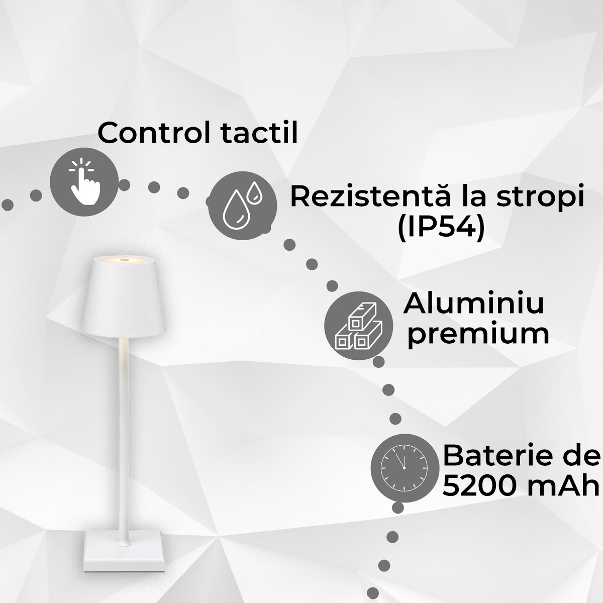 Set 2 lampi de masa touch led incarcabile Echo Soul®️, ambientale cu control tactil, functie de schimbare a intesitatii, 3 temperaturi de culoare cald, neutru, rece, 5 W, acumulator 5200 mah, Alba
