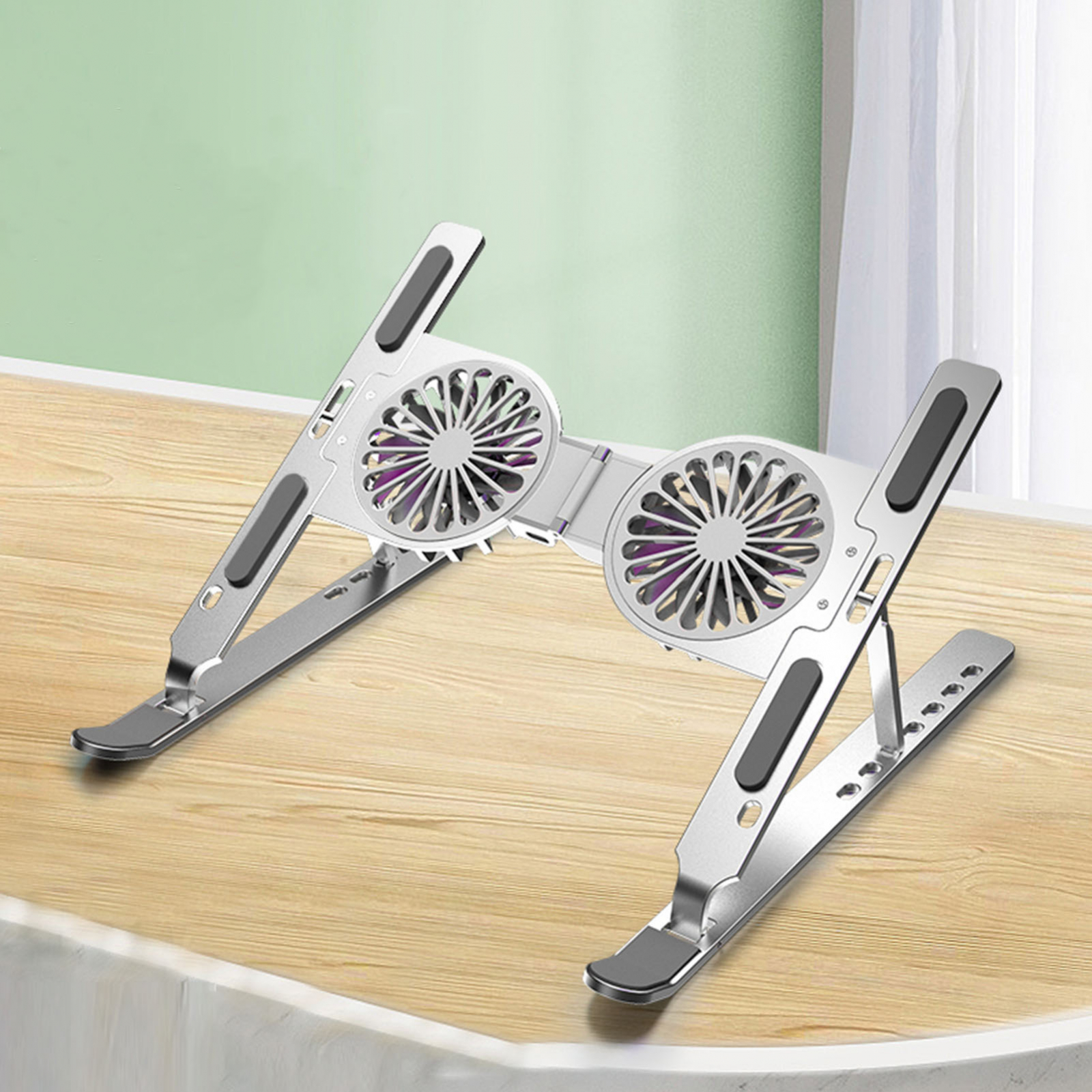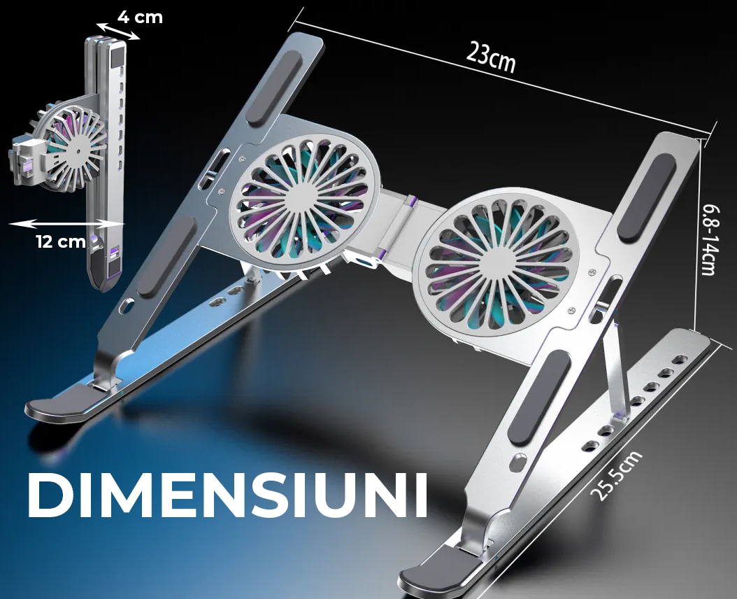 Suport pentru laptop Echo Soul®, ergonomic, portabil, pliabil, detasabil, cu sistem dublu de ventilatie prin cooler, compatibil cu laptopuri de la 10 - 15.6 inch, fabricat din aluminiu, Argintiu Deschis - Echo Soul®
